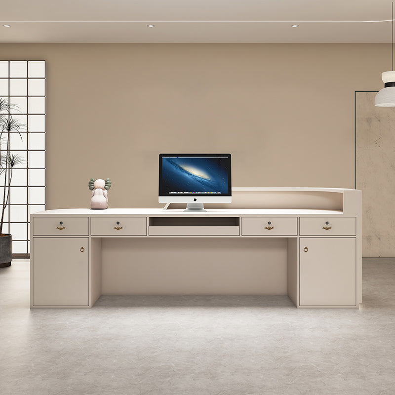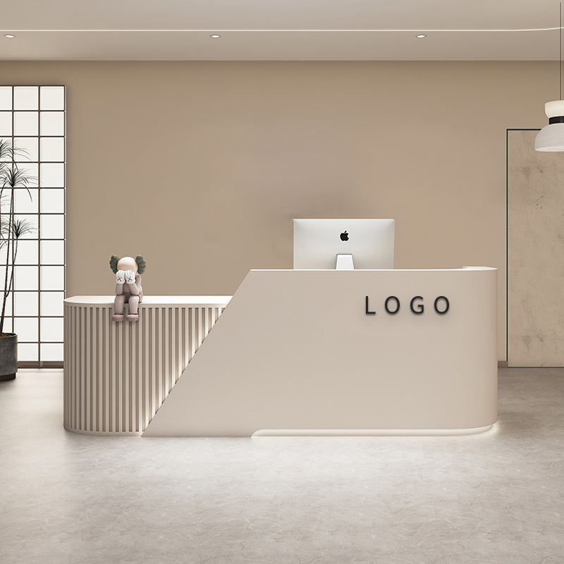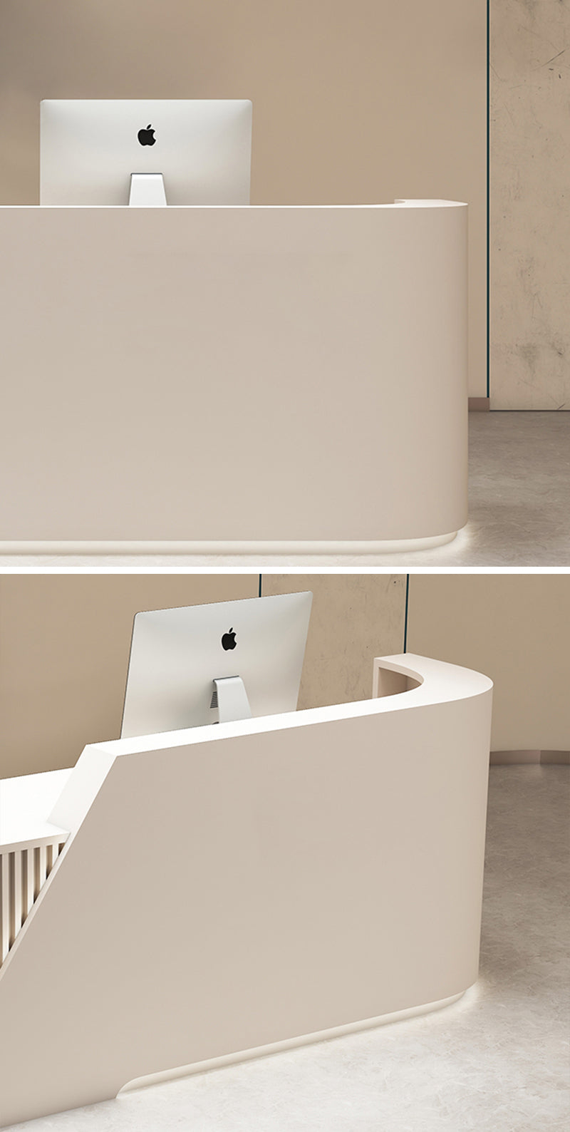 このL型の受付カウンターは、そのデザインのシンプルさと高級感が組み合わさり、