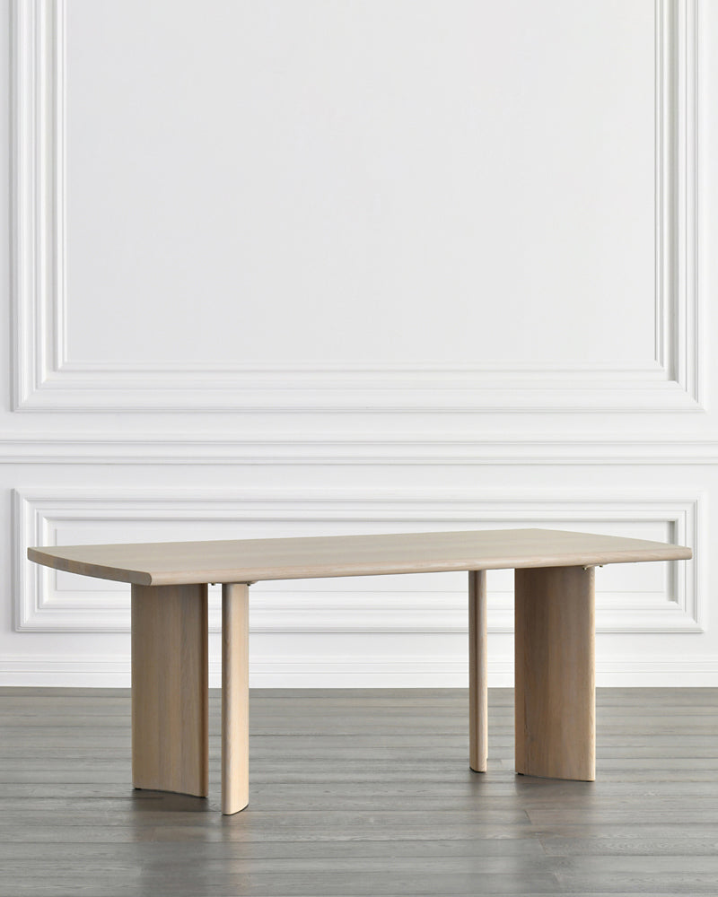 木目の流れが美しい木肌を持ち、テーブルの両側に円弧が施され、視覚的な温かさを提供します。