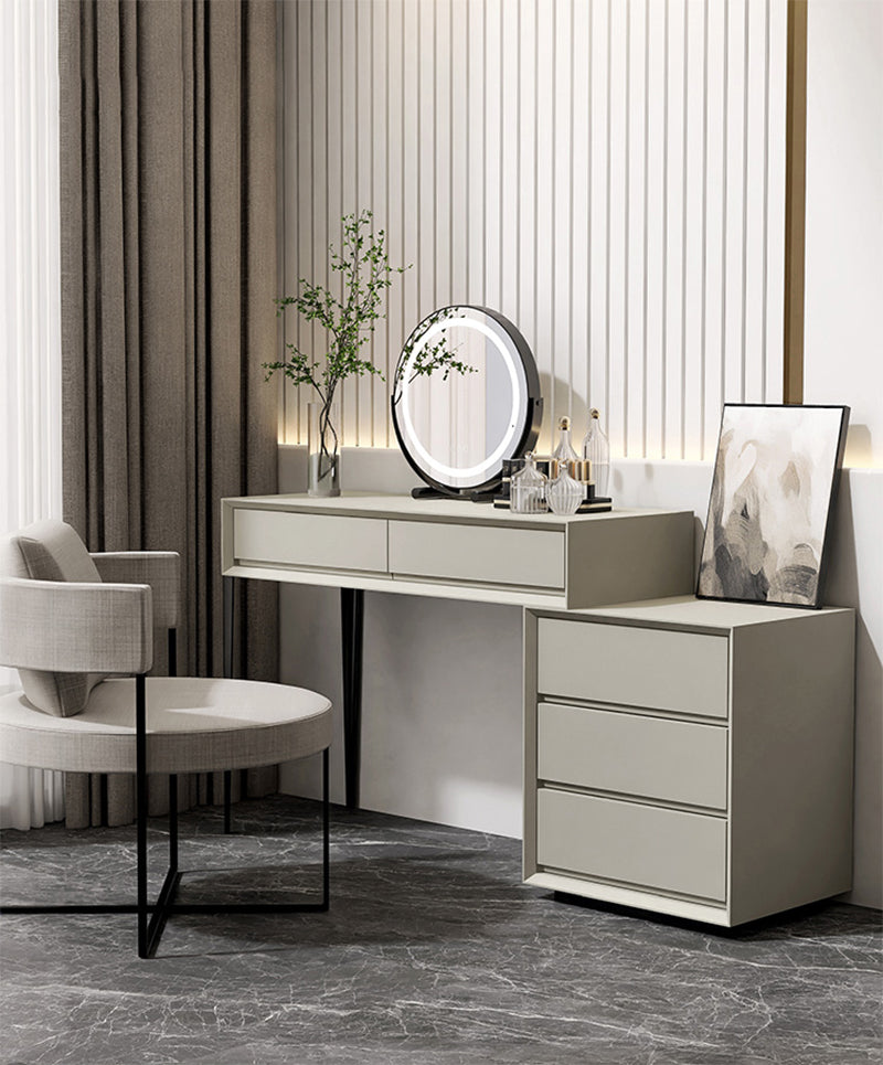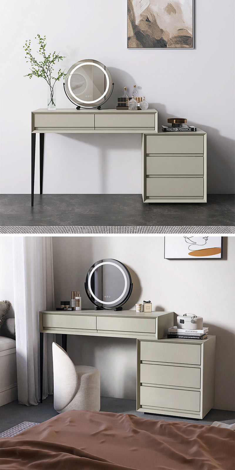 化粧品、ジュエリー、香水などは、化粧台のキャビネットと化粧台の左側に、金属製のスライドでスムーズにスライドする 。