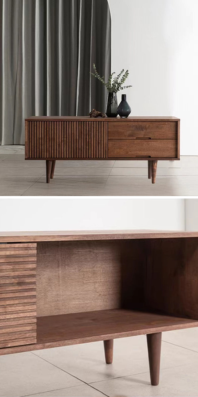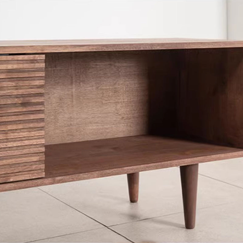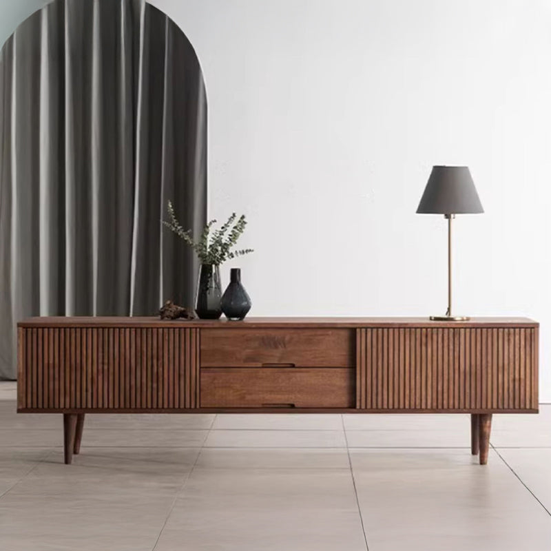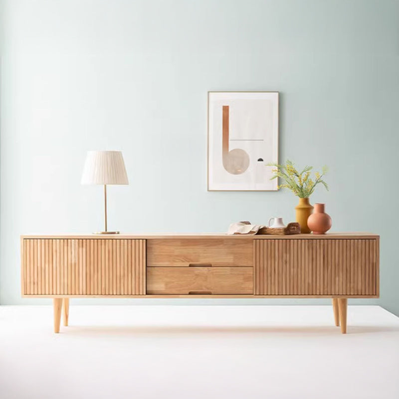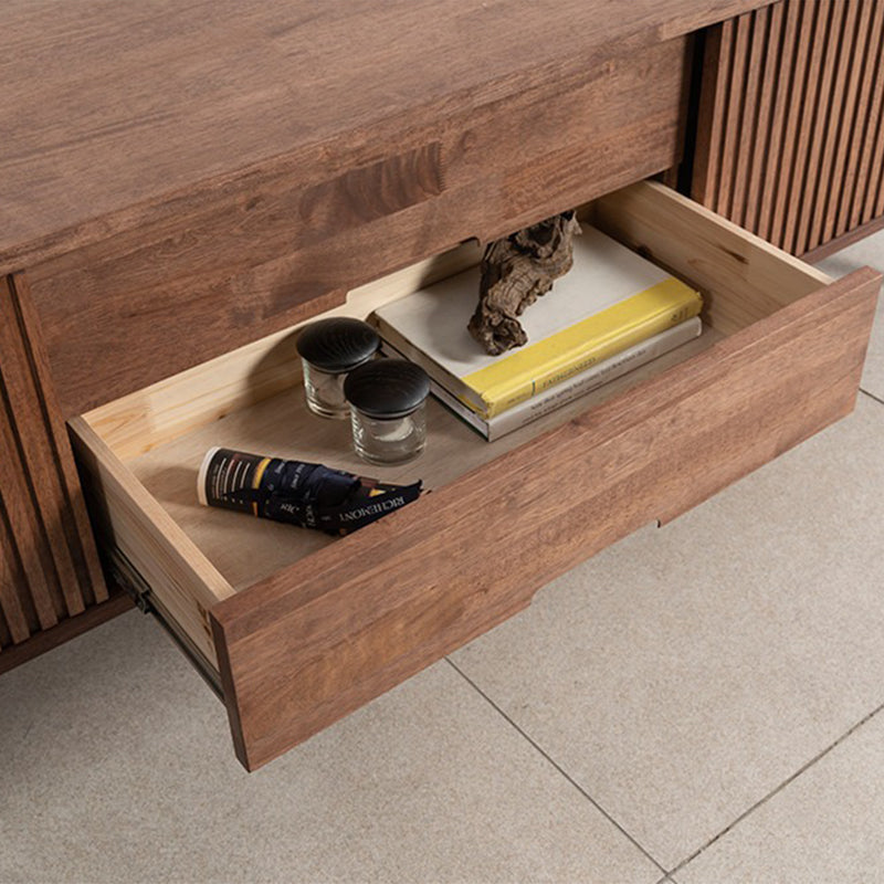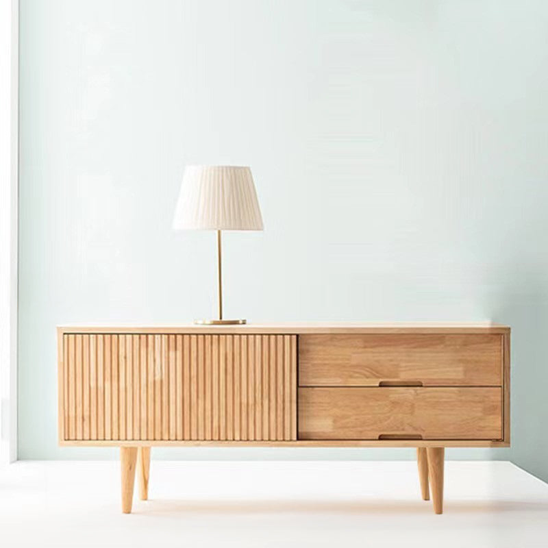 中央には引き出しが二段設けられており、リモコンや充電ケーブルなどをすっきり収納。両側の縦方向の木目が施された扉の中は隠れ収納スペースとして活用でき、収納力も抜群です。