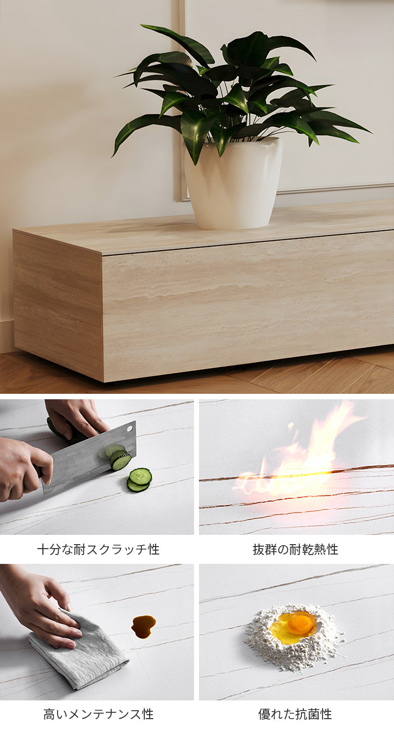 天板にはトラバーチン柄の高級シントレードストーンを採用し、石の風合いを思わせる穏やかな質感を表現しています。