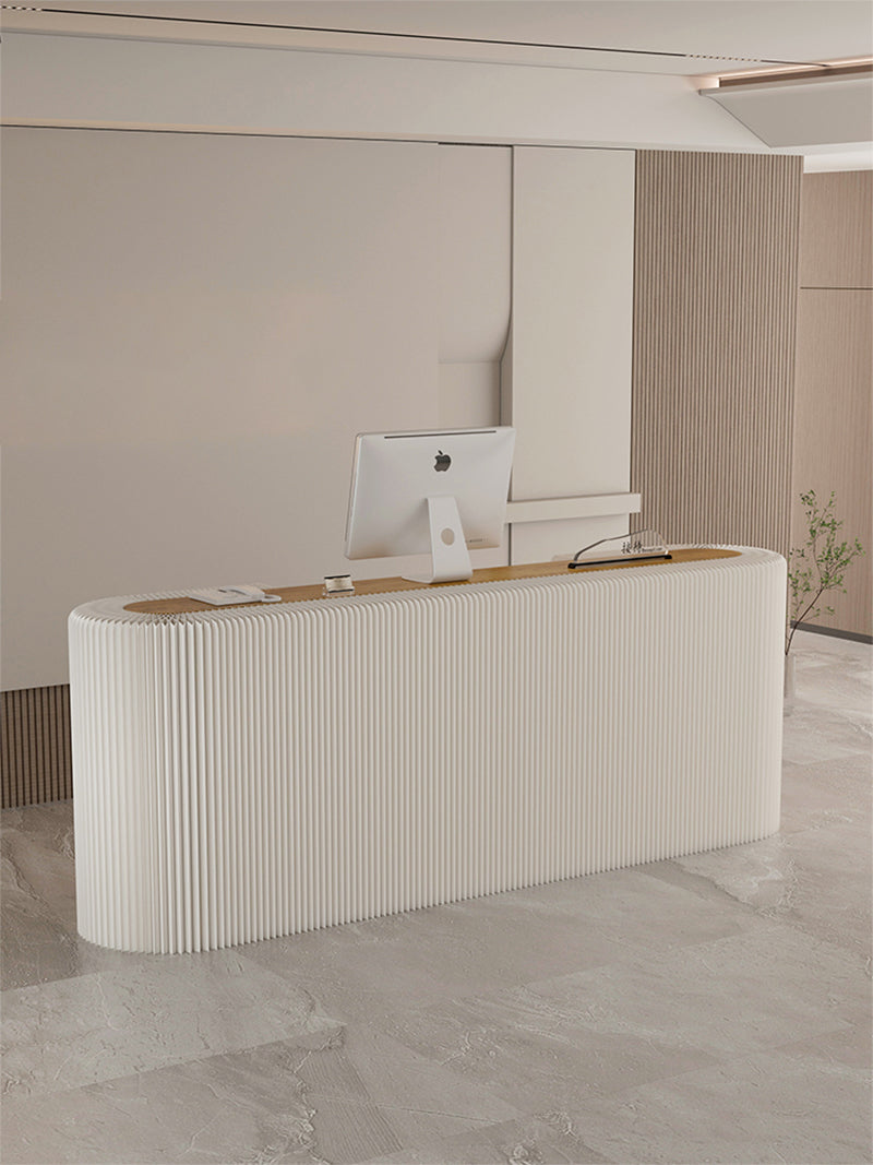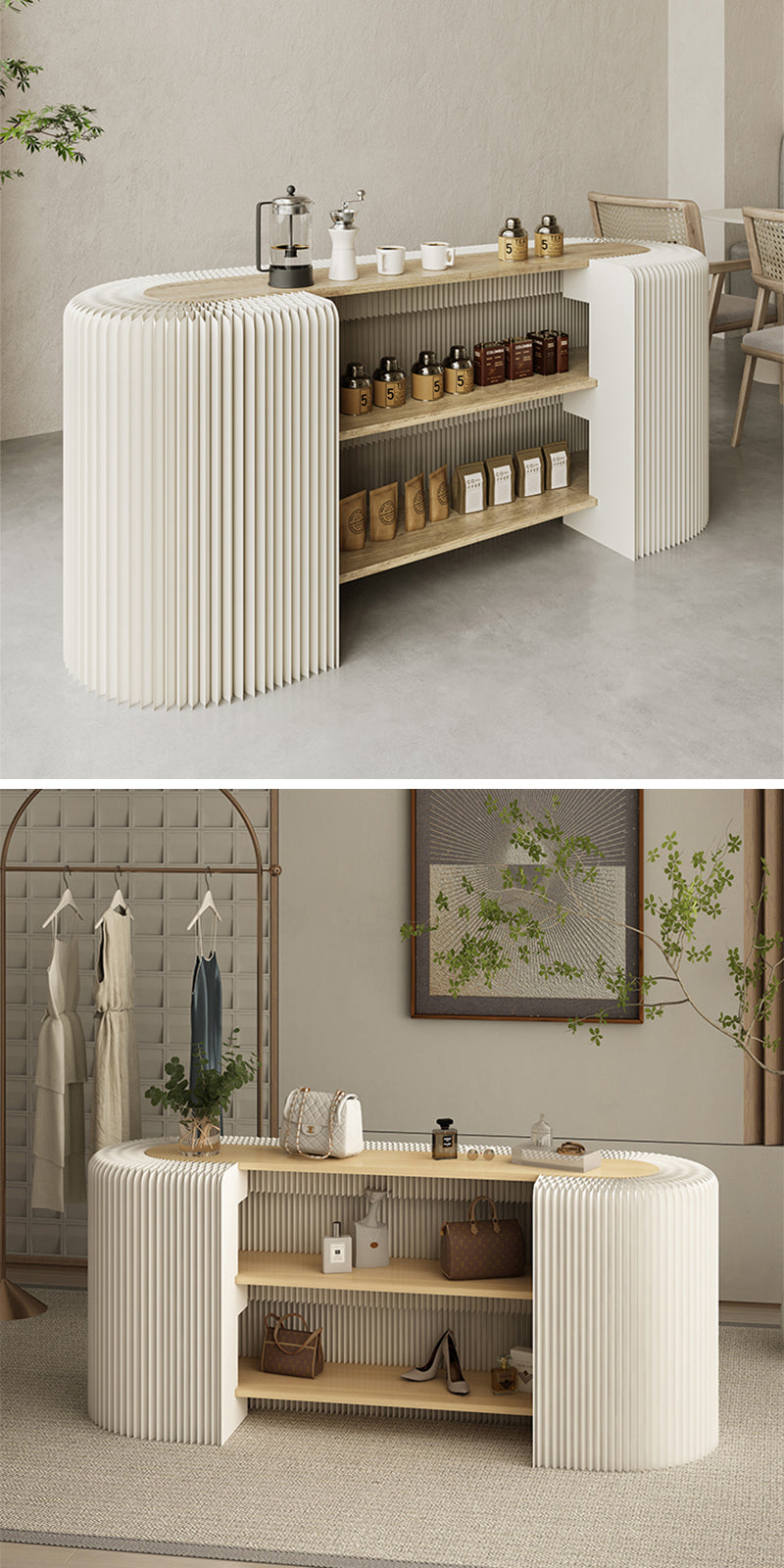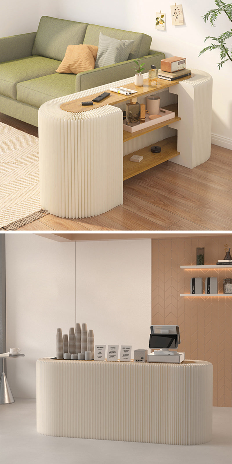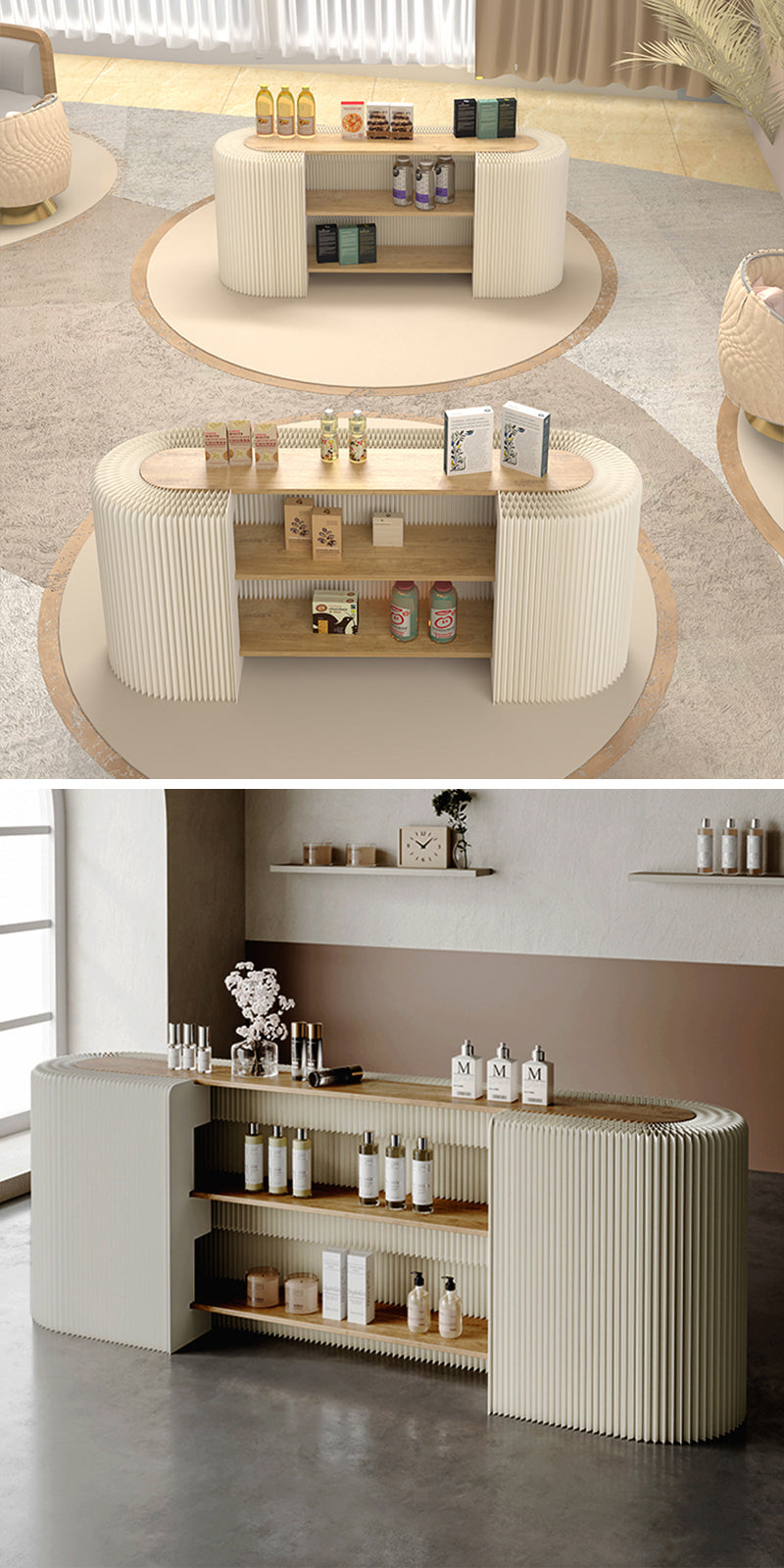カウンターテーブルは、クラフト紙素材を使用し、環境に配慮した設計が施されています。