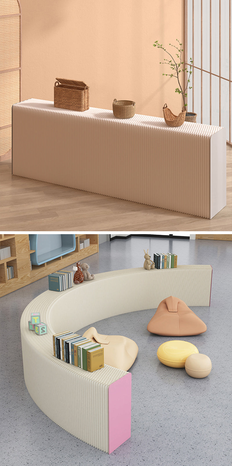 カラフルなサイド板とクラフト紙素材は、空間に温かみと個性をもたらし、ビジュアル的に魅力的です。