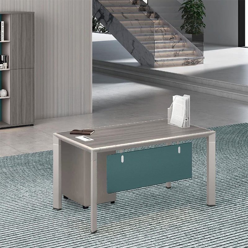 シンプルで現代的なデザインが特徴で、色合いは落ち着いたグレー木目と爽やかなターコイズブルーのアクセントで、オフィス空間に明るさを加えます。