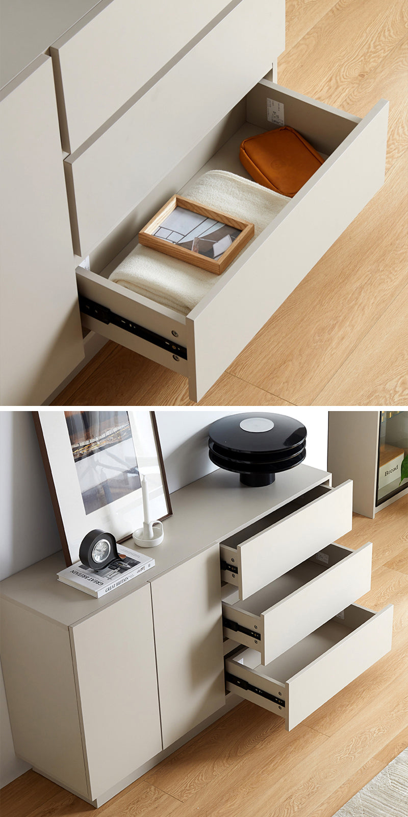 キャビネット内には大きな収納スペースが用意されており、アイテムを効果的に整理できます。左側には2つの大きな棚があり、右側には3つの引き出し式の収納スペースがあり、小物の収納に適しています。