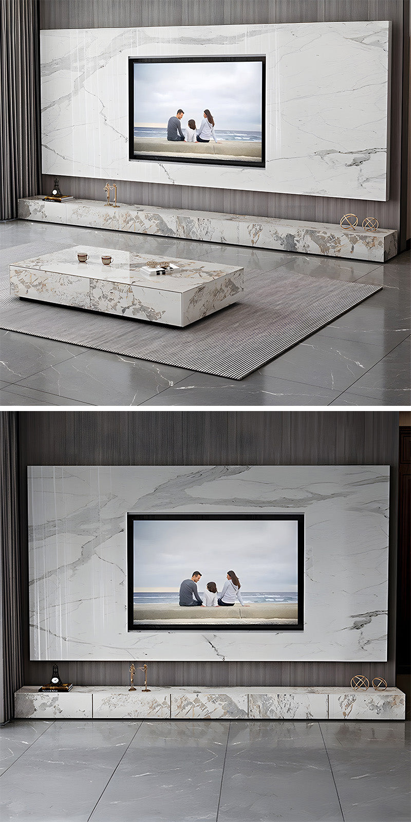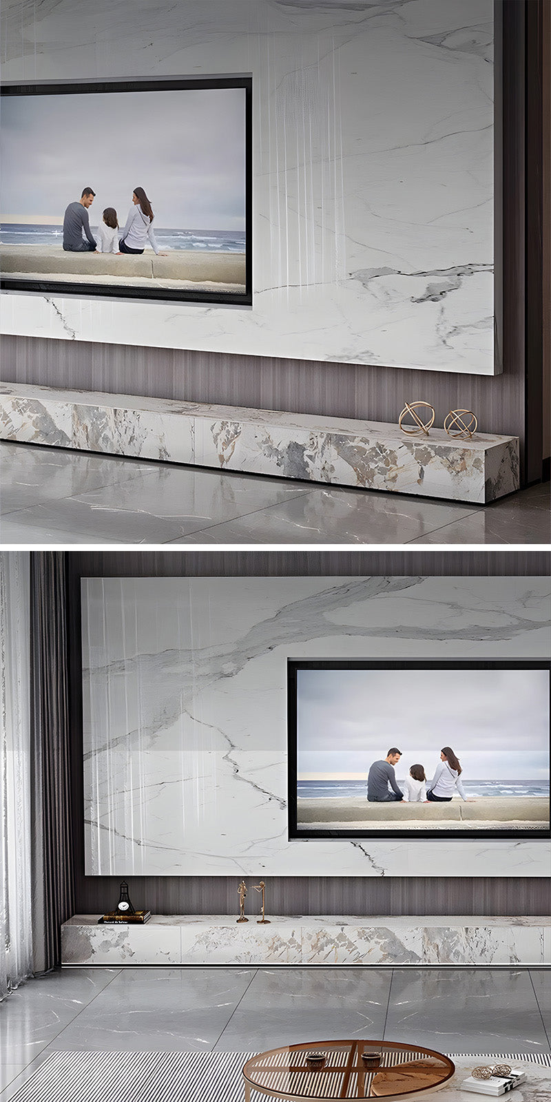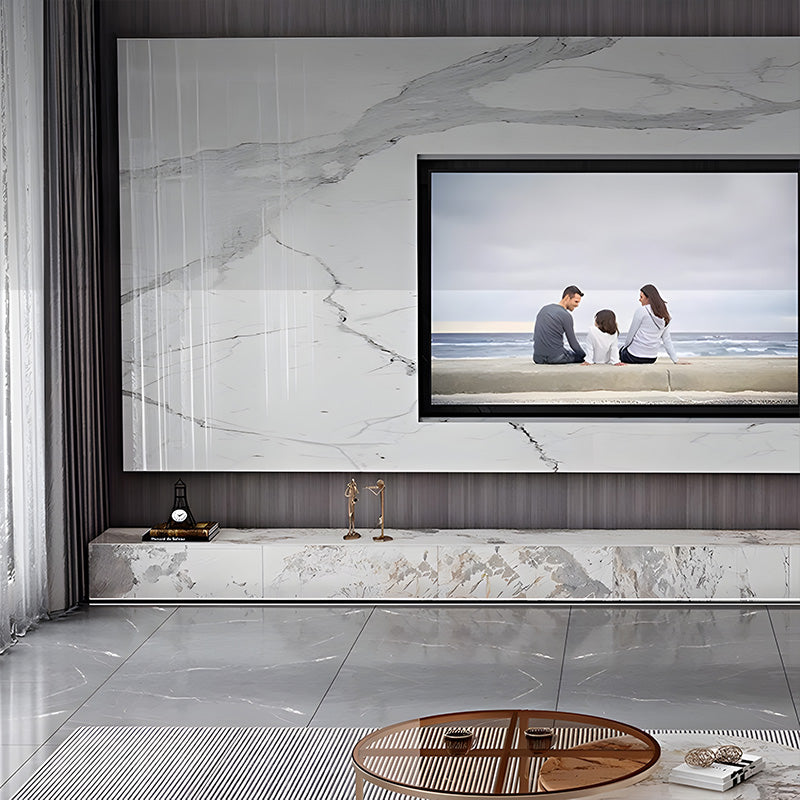 このテレビ台は、上質な素材感と美しいデザインでリビング空間を優雅に整え、静謐で高貴な印象を与えます。