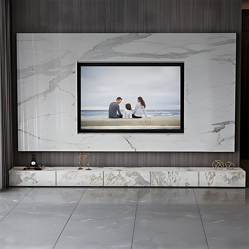 パンドラ模様のセラミック天板が、洗練された天然石の美を忠実に再現し、モダンで直線的なデザインと見事に融合します。
