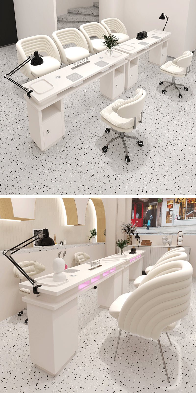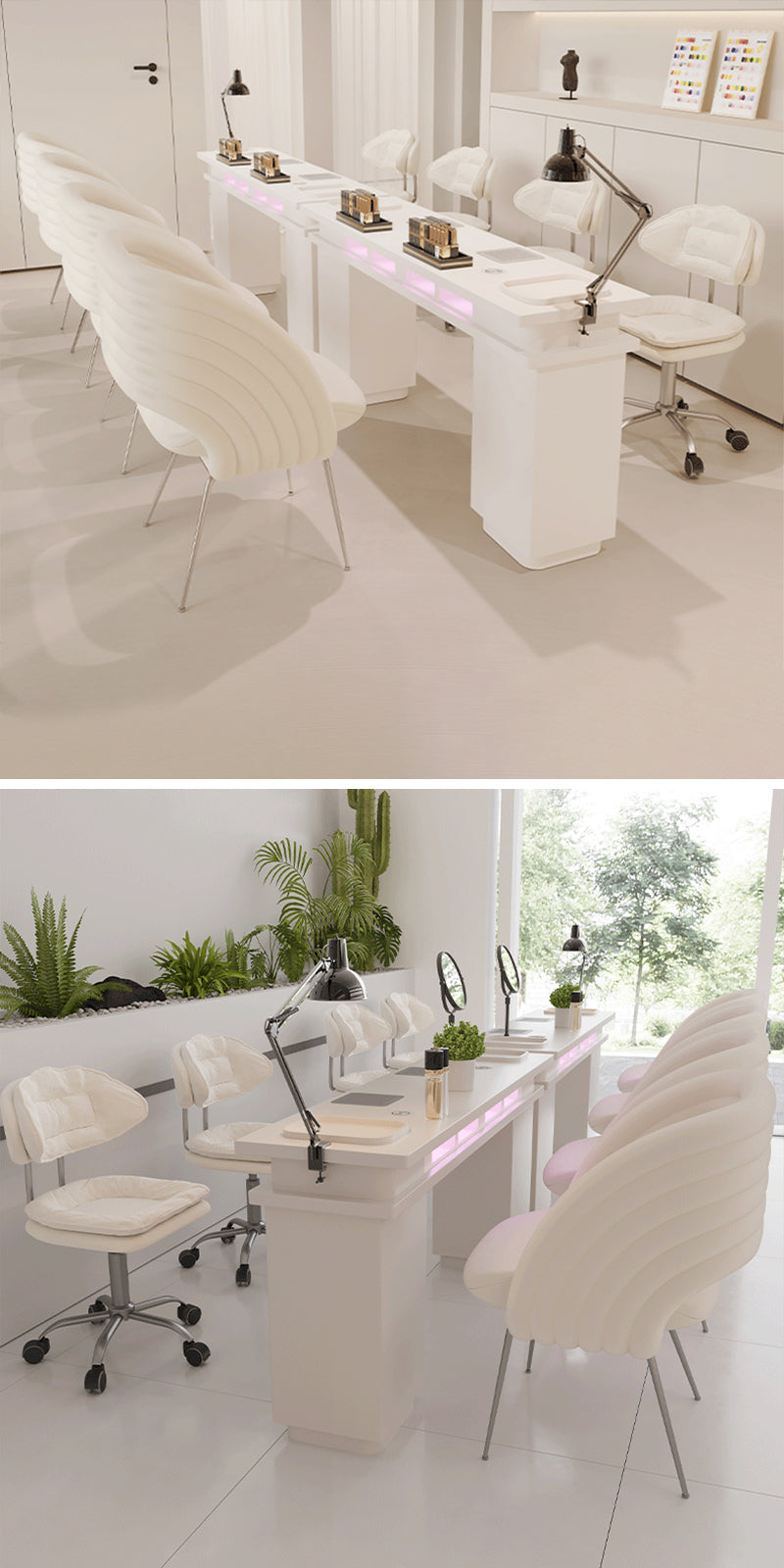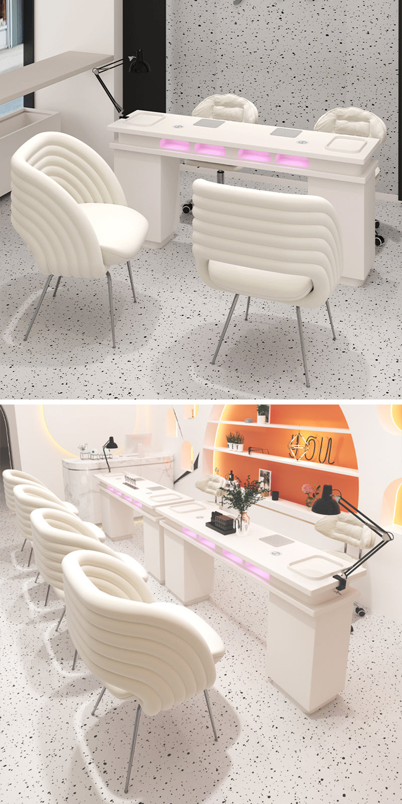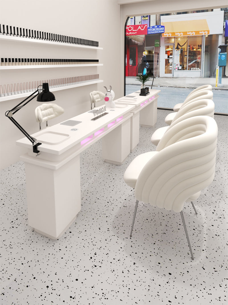 モダンな空間に最適なネイルテーブル、高級感あふれるプリント合板の天板と、快適なベルベットチェアが組み合わさり、お店に洗練された雰囲気をもたらします。