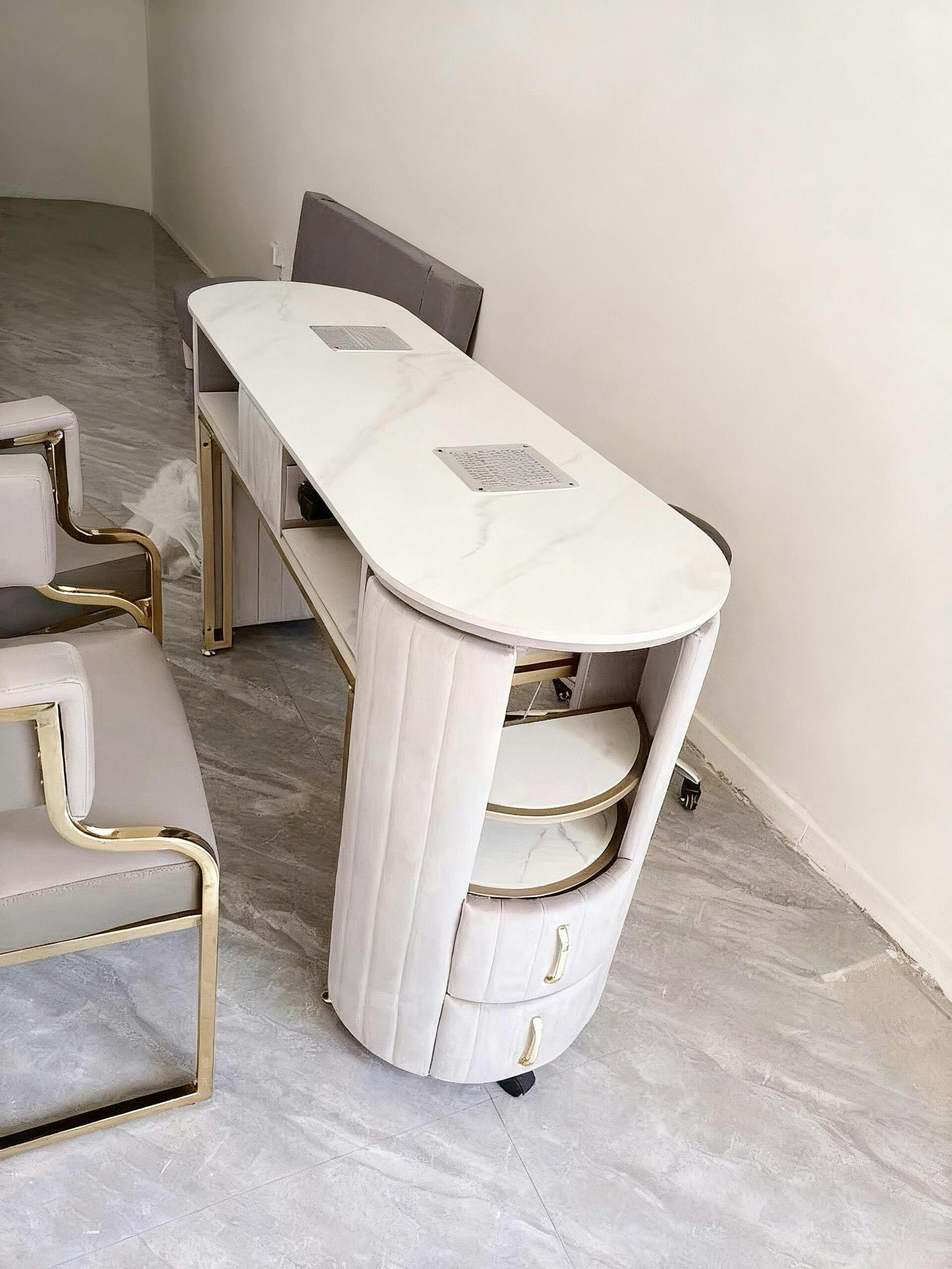 ネイルテーブルは全体的にやわらかな丸みを帯びたデザインであり、優しい雰囲気を醸し出します。優雅なデザインは、ネイルサロンにリラックスした雰囲気をもたらし、お客様に快適な時間を提供します。