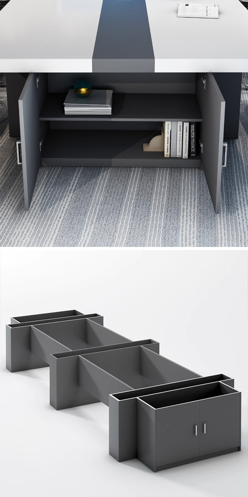 また、テーブルの側面には物置スペースが設けられており、事務資料や必要なアイテムを整理でき、会議室を整然とした状態に保ち、スッキリとした雰囲気を作り出します。