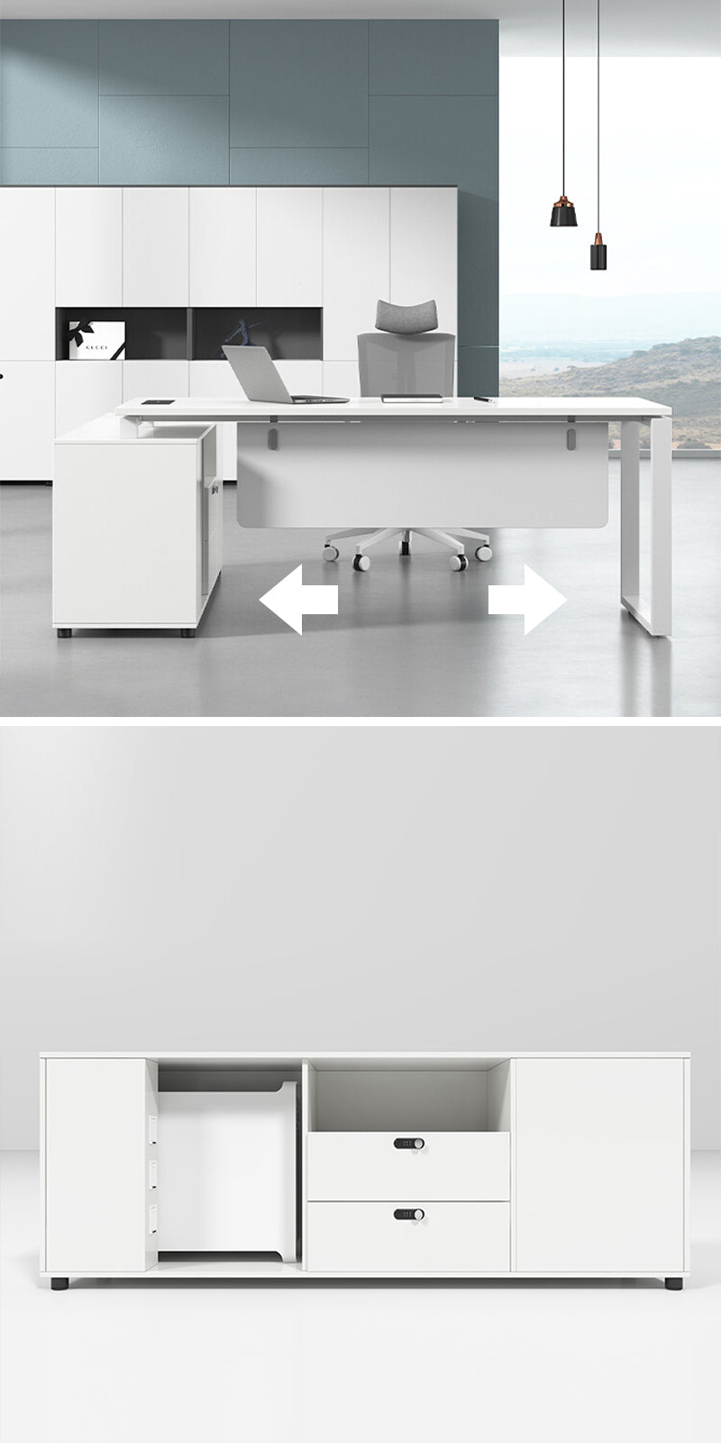 また、引き出しや収納スペースが豊富に用意されており、文書や書類、オフィス用品などを整理整頓するのに便利です。