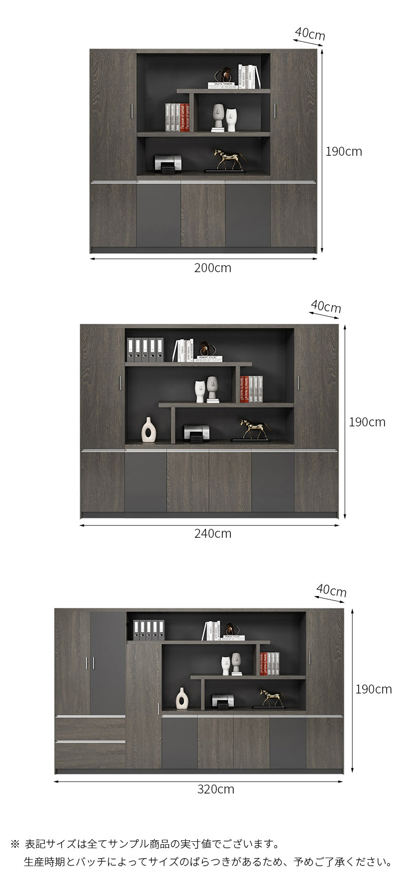 オープン収納と扉付き収納をバランスよく配置し、書類、書籍、装飾品、オフィス機器などを効率的に収納可能。