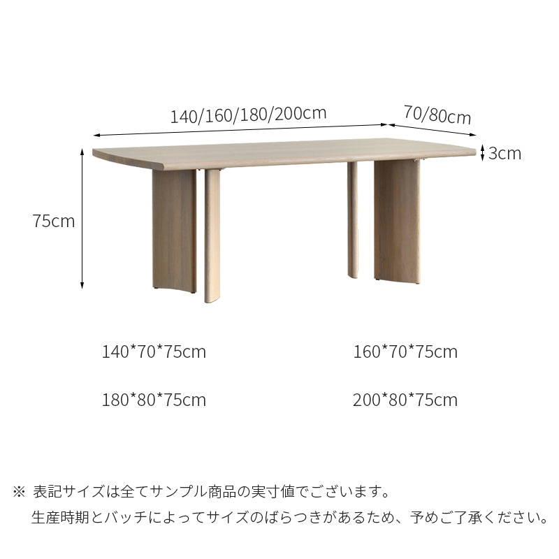 木目の流れが美しい木肌を持ち、テーブルの両側に円弧が施され、視覚的な温かさを提供します。