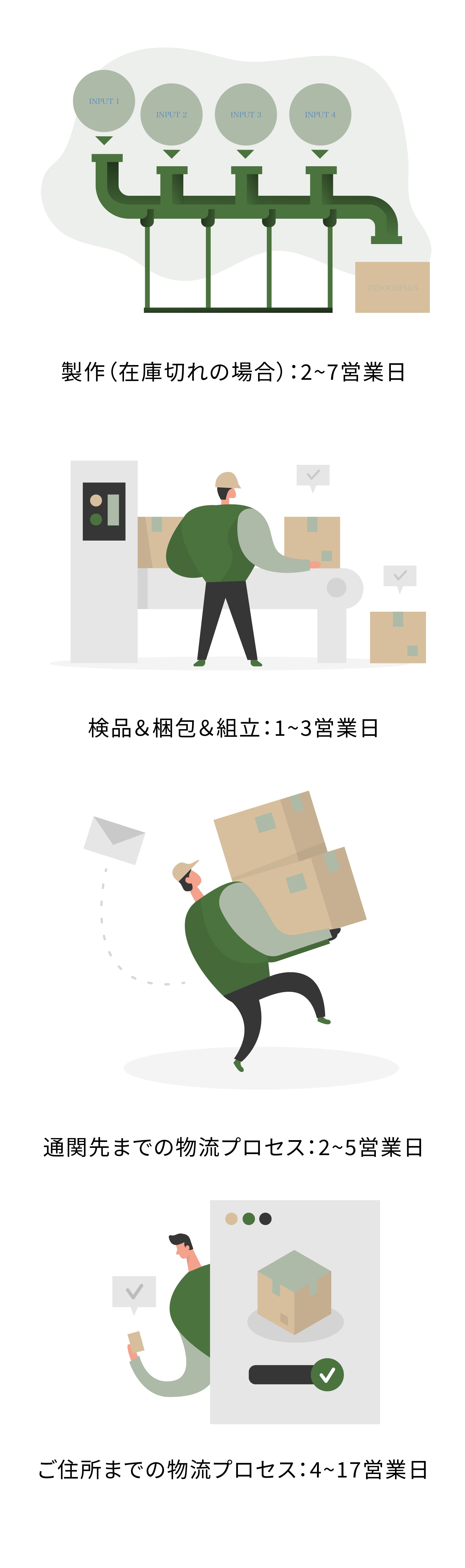 商品のカテゴリーによって異なる配送日数がございます。各商品の購入ページには詳細情報が掲載されていますので、お手数ですが該当商品ページの「配送」をご確認いただき、ご理解いただけますようお願いいたします。