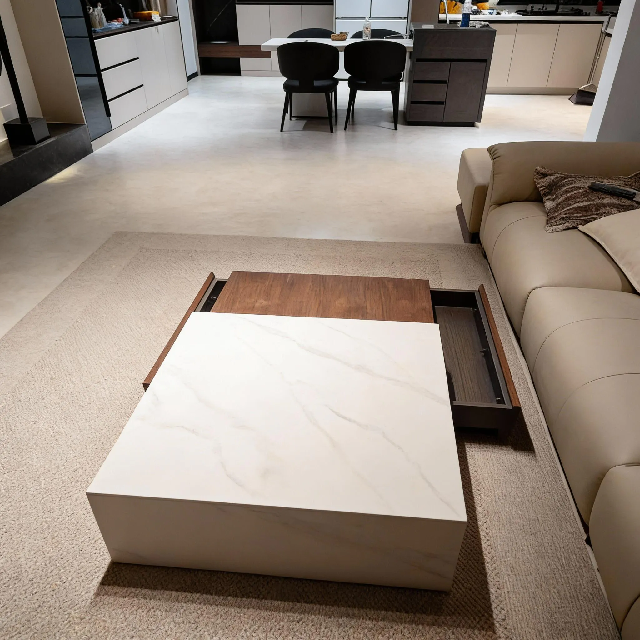 この異なる素材の組み合わせは、他の家具や装飾品と調和しやすく、様々なインテリアスタイルに合います。